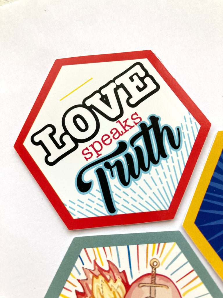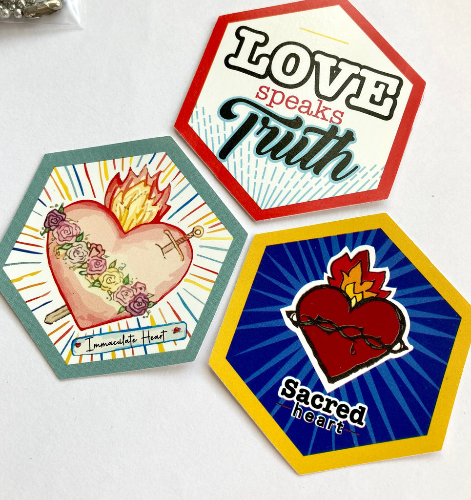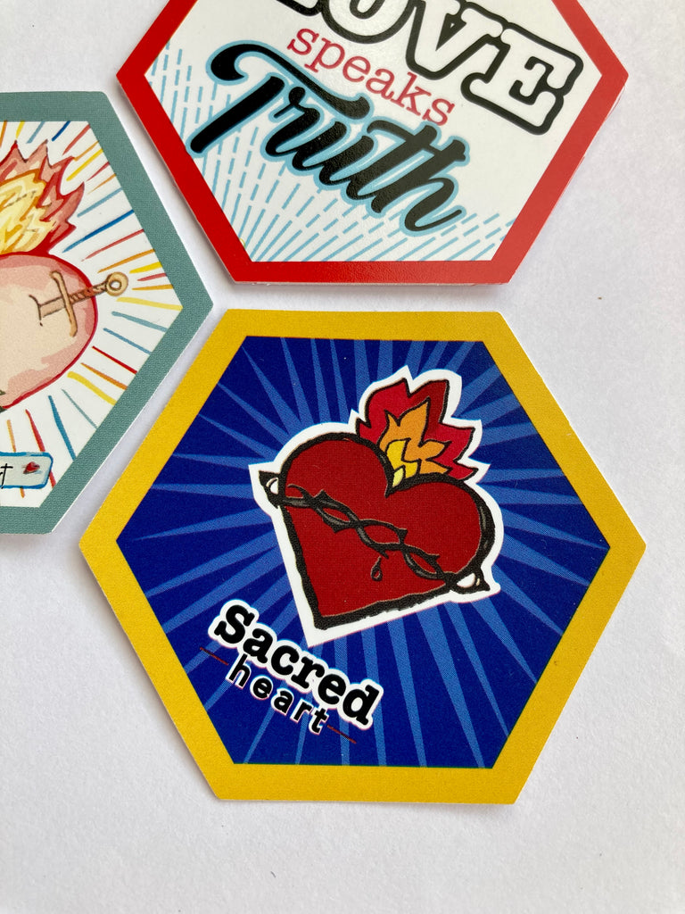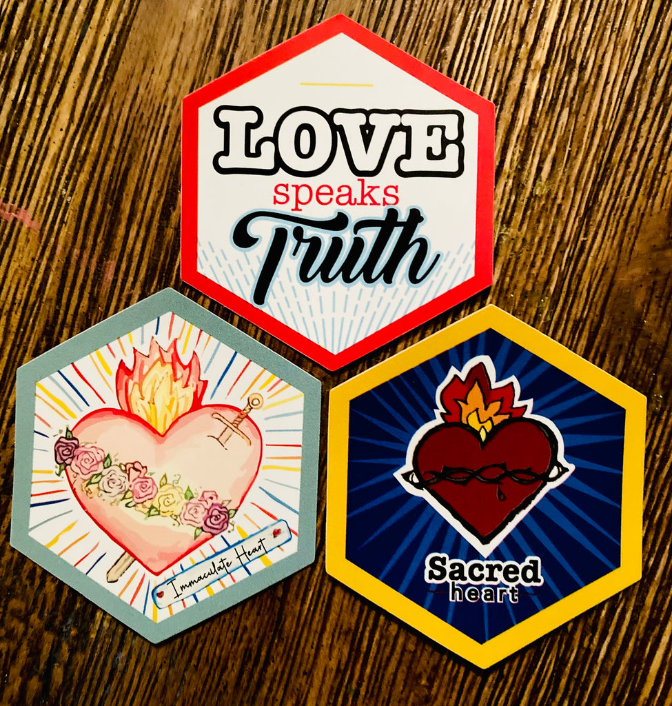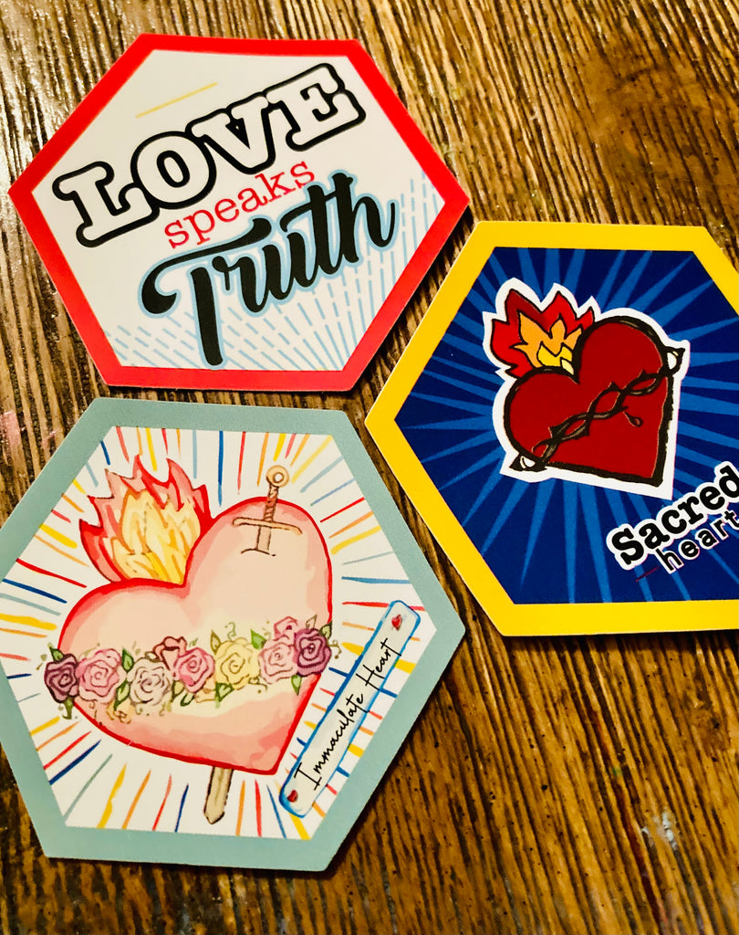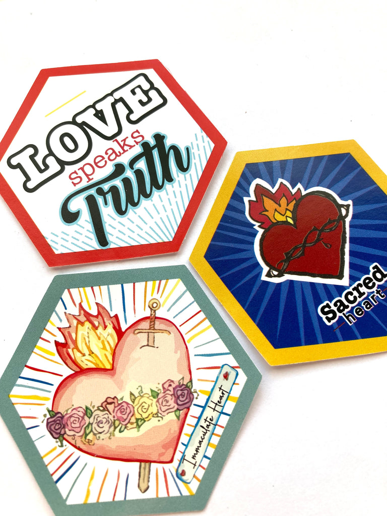 Do you have a devotion to the Sacred heart of Jesus or the Immaculate heart of Mary? These fun hexagon shaped stickers are a perfect way to help us showcase our devotion and a good way to remind us of what true love is.